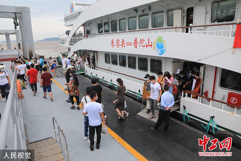 2020年6月2日,舟山市普陀山客运码头,大批游客下船进入景区。陈永建/人民视觉
