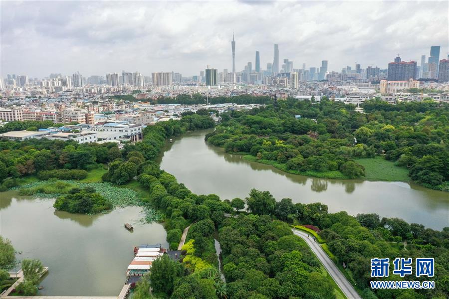 海珠湿地岭南佳果荔枝和黄皮正值挂果期(6月3日无人机照片)。海珠湿地传承万亩果园岭南基塘农业文化遗产,恢复6平方公里垛基果林挂果能力,果树树种从原来10余种增加到200多个品种。新华社记者刘大伟摄