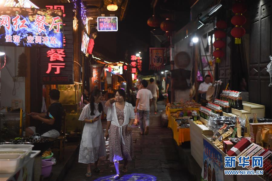 6月11日,游客在湘西土家族苗族自治州永顺县芙蓉镇景区内游览。 近日,湘西土家族苗族自治州永顺县芙蓉镇景区在做好疫情防控的情况下恢复开放。夜幕降临,景区内的瀑布、吊脚楼与灯光交相辉映,美不胜收,吸引许多游客前来休闲、参观。 新华社记者 薛宇舸 摄