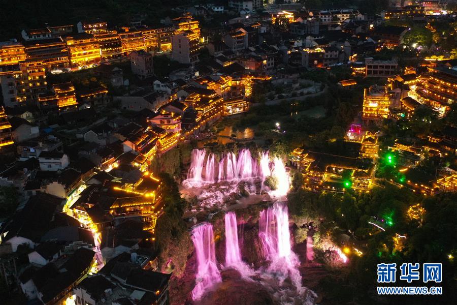 这是6月11日拍摄的湘西土家族苗族自治州永顺县芙蓉镇景区(无人机照片)。 近日,湘西土家族苗族自治州永顺县芙蓉镇景区在做好疫情防控的情况下恢复开放。夜幕降临,景区内的瀑布、吊脚楼与灯光交相辉映,美不胜收,吸引许多游客前来休闲、参观。 新华社记者 薛宇舸 摄