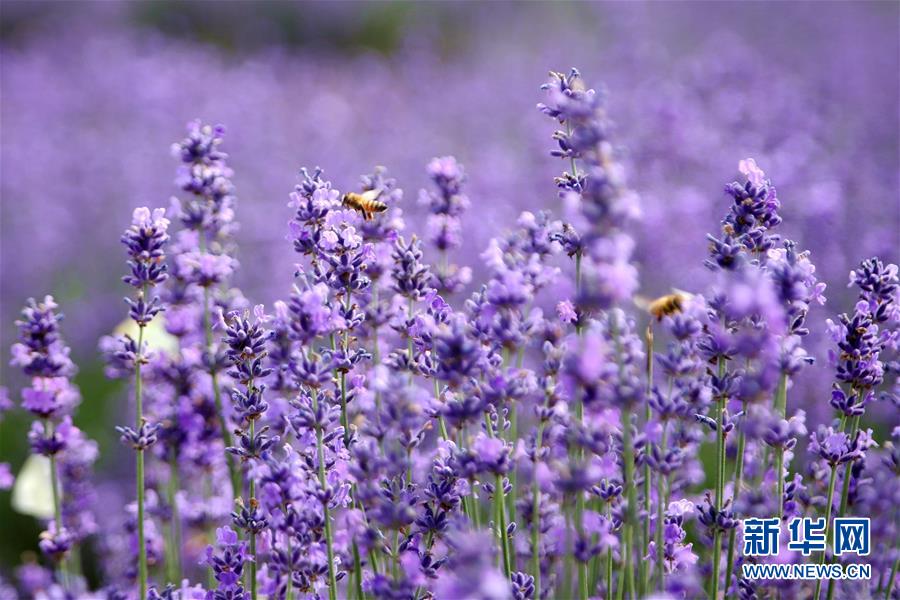 6月15日,在山东省青岛西海岸新区生态观光园,蜜蜂在薰衣草丛中飞舞。 近日,山东青岛西海岸生态观光园百亩薰衣草进入盛花期,馥郁芬芳,吸引游客前来观赏。 新华社发(王培珂 摄)
