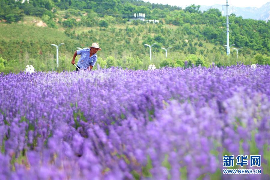 6月15日,在山东省青岛西海岸新区生态观光园,一名农工在薰衣草丛中劳作。 近日,山东青岛西海岸生态观光园百亩薰衣草进入盛花期,馥郁芬芳,吸引游客前来观赏。 新华社发(王培珂 摄)