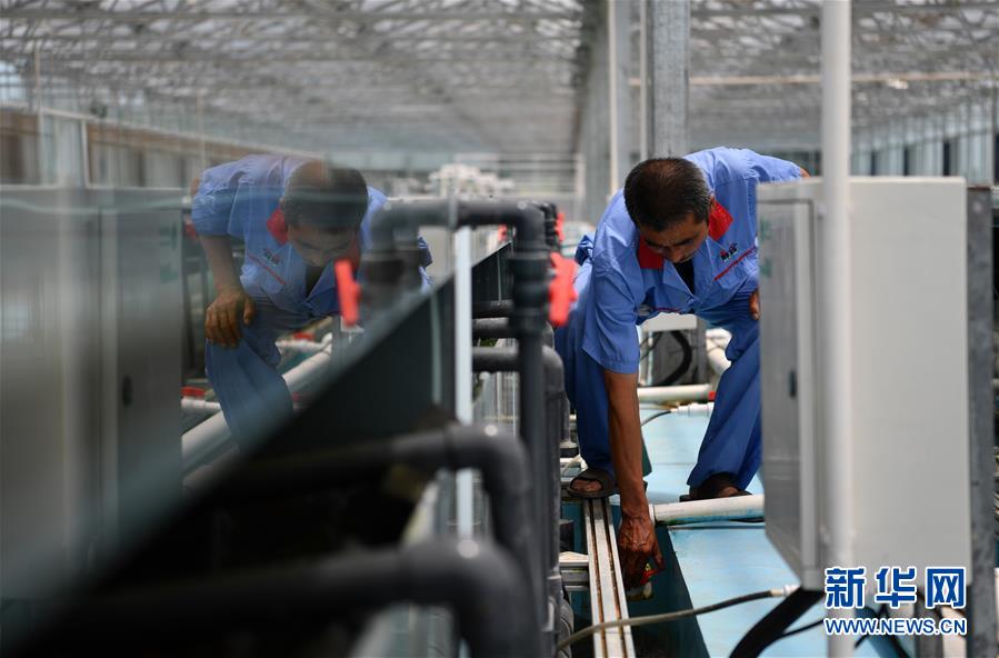 在天津现代晨辉科技集团有限公司的养殖示范场,工人在调试设备(6月15日摄)。 近年来,天津市宝坻区大白庄镇大力发展观赏鱼养殖,在当地龙头企业的带动下,成为增加农民收入的新途径。据了解,企业对附近养殖户统一提供苗种、饲料、技术支持,以及观赏鱼成鱼后保价回收的服务。养殖户每亩水面平均收入约1.8万元,解决周边农民就业近200人。 新华社记者 李然 摄