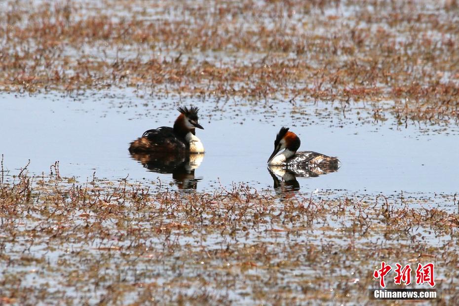 入夏以来,新疆巴里坤草原迎来众多候鸟在此栖息。夏季草原湿地的水域和芦苇荡内,赤麻鸭、白鹭、凤头??、渔鸥等水鸟翩跹飞舞、休憩觅食,刚刚孵化的幼鸟成群结队戏水游弋,一派生机勃勃的迷人景象。近年来,巴里坤持续加大生态文明建设和环境保护力度,以“绿水青山就是金山银山”的发展理念,天然生态环境得到有效守护,草原湿地绿草如茵、碧波荡漾,成为侯鸟的乐园。 张建刚 摄