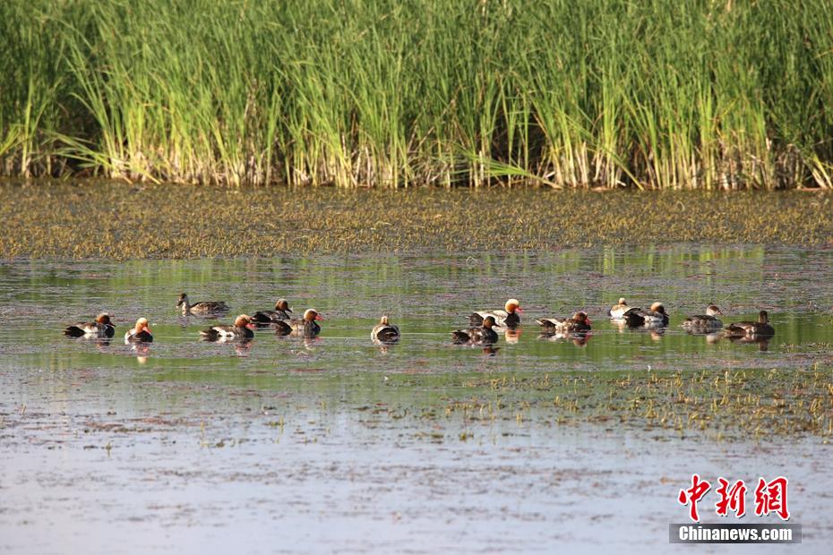 18日,潜鸭群在巴里坤草原湿地的水面上游弋。 张建刚 摄