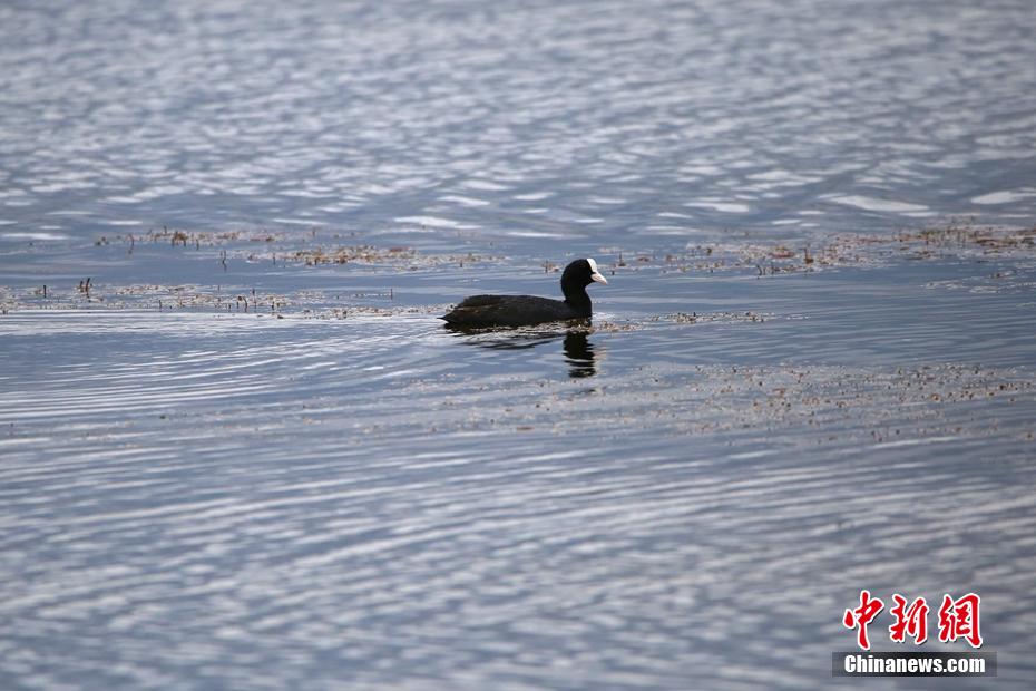 18日,一只黑水鸡在巴里坤草原湿地的水面上游弋。 张建刚 摄