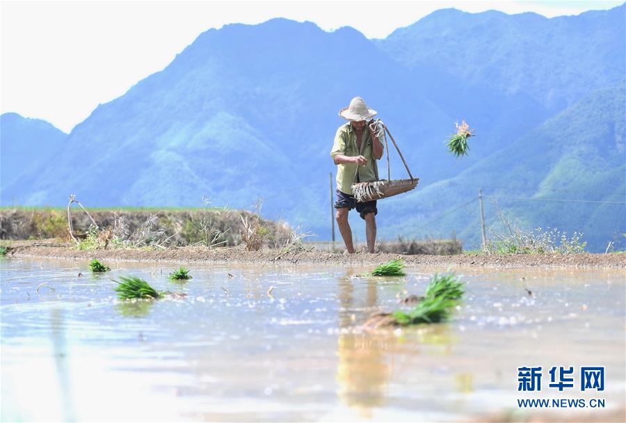 6月23日,村民将水稻秧苗抛向田间。 念山梯田位于福建省政和县星溪乡念山村,历史悠久。近年来,当地政府引导农民以传统方式耕种梯田,促进农业生态资源的保护和利用,展现高山梯田自然生态景观和历史悠久的农耕文化。 新华社记者林善传摄