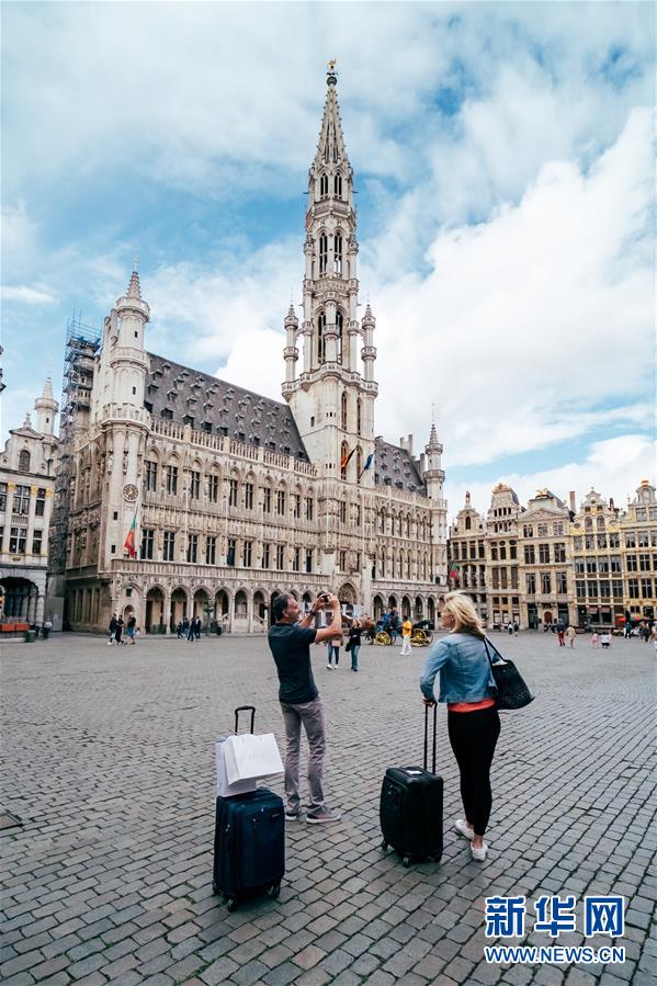 6月28日,两名来自英国的游客在比利时布鲁塞尔大广场游览。 近日,随着欧盟国家间逐步开放边境,比利时布鲁塞尔游客逐渐增多。 新华社记者 张铖 摄