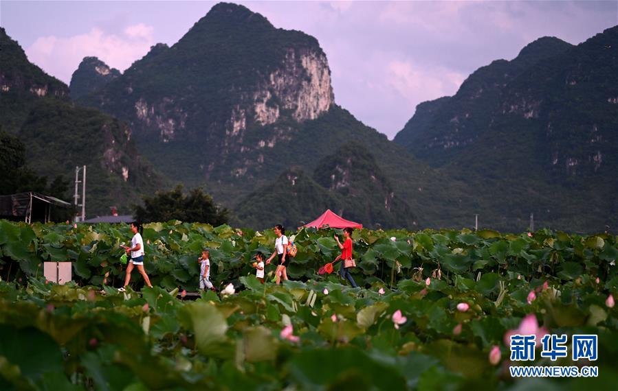 6月28日,游客在广西柳州市柳江区百朋镇万亩荷塘里游玩。新华社发(黎寒池 摄)