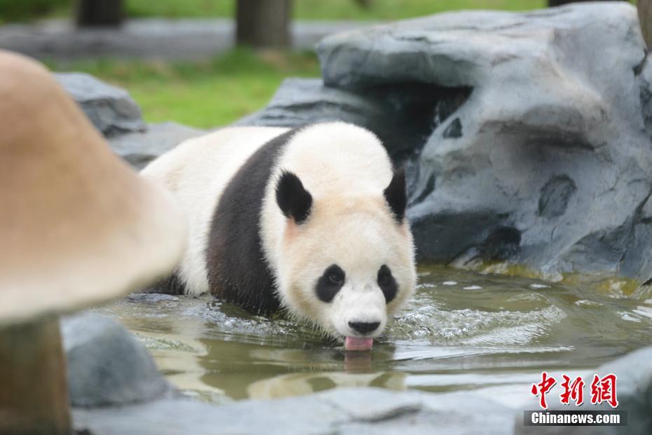 7月1日,大熊猫“京宝”在水池喝水。当日,湖南凤凰中华大熊猫苑开园。从四川转运湖南省湘西土家族苗族自治州凤凰县安家的8只大熊猫,经过一个月适应期后正式与公众见面。中新社记者 杨华峰 摄