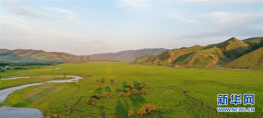乌兰毛都草原景色(7月1日无人机照片)。 盛夏时节,内蒙古兴安盟科尔沁右翼前旗的乌兰毛都草原绿意盎然,风景醉人。 乌兰毛都草原地处大兴安岭南麓,属丘陵山地草原,风光独特。 新华社记者 徐钦 摄