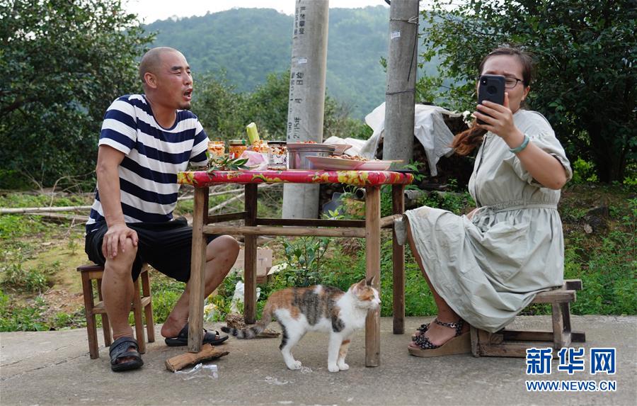 7月1日,蒋金春(左)和妻子邢召一边吃饭一边直播。新华社记者 周密 摄