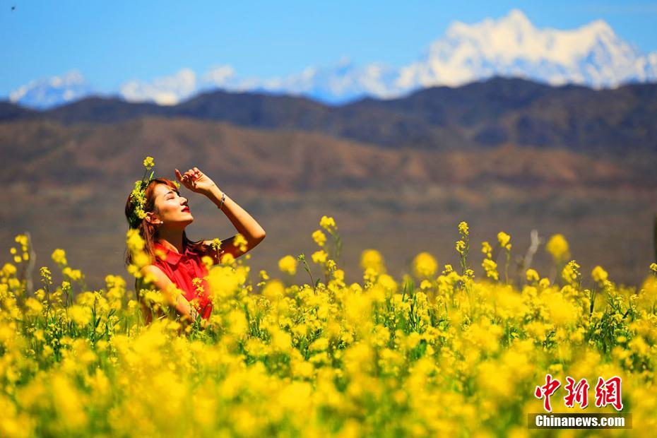 偶有身着鲜艳服饰的姑娘沉醉在花海中。 李靖海 摄