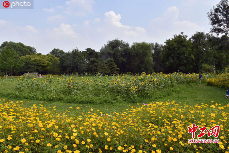 2020年7月5日,北京,游客在奥森公园向日葵园内拍照。当日,北京奥林匹克森林公园北园的百亩葵园迎来了盛花期,金黄的向日葵花像一张张“笑脸”迎风摇曳,花若金太阳,吸引许多市民前来观赏游玩,竞相拍照记录下美好的画面。青春/IC photo