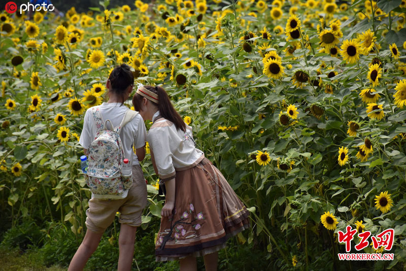 2020年7月5日,北京,游客在奥森公园向日葵园内拍照。当日,北京奥林匹克森林公园北园的百亩葵园迎来了盛花期,金黄的向日葵花像一张张“笑脸”迎风摇曳,花若金太阳,吸引许多市民前来观赏游玩,竞相拍照记录下美好的画面。青春/IC photo