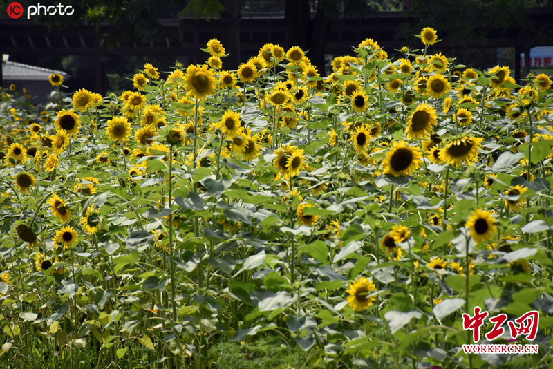 2020年7月5日,北京奥林匹克森林公园北园的百亩葵园迎来了盛花期,金黄的向日葵花像一张张“笑脸”迎风摇曳,花若金太阳,吸引许多市民前来观赏游玩,竞相拍照记录下美好的画面。青春/IC photo