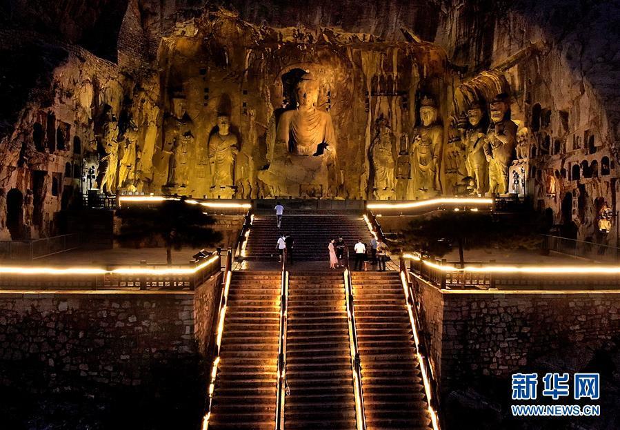 7月7日,游客在洛阳龙门石窟景区奉先寺夜游(无人机照片)。近日,河南洛阳的夜晚愈发缤纷多彩。立足于厚重的隋唐文化底蕴,洛阳正通过创新夜游产品打响“古都夜八点”品牌,激活文旅消费。新华社记者李安摄