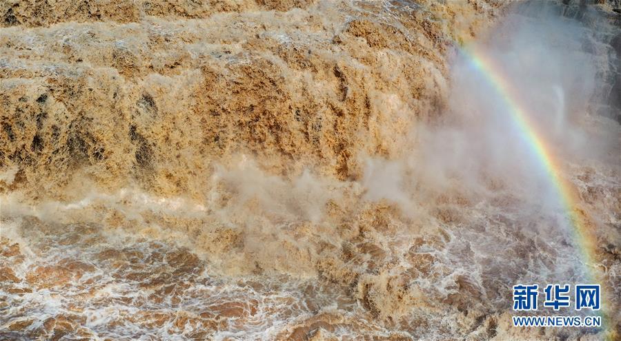 7月7日,黄河壶口瀑布主瀑上出现彩虹(无人机照片)。 近日,位于秦晋大峡谷的黄河壶口瀑布出现难得一见的“金色瀑布”景观。 新华社记者 陶明 摄