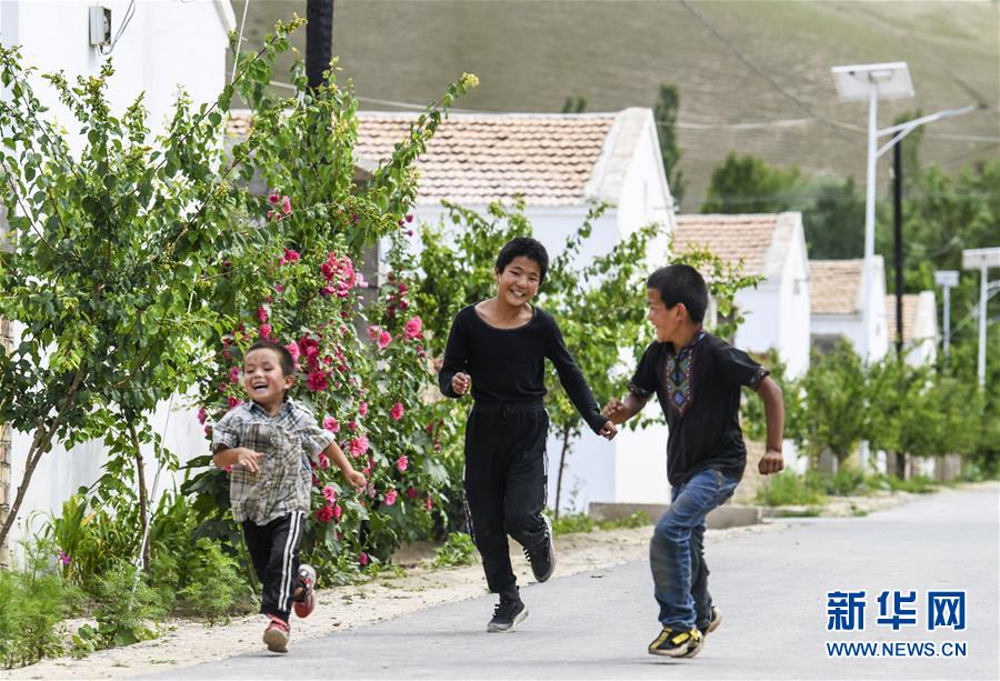 在新疆特克斯县境内的牧民定居点,小朋友在巷道内追逐玩耍(7月6日摄)。新华社记者 王菲 摄