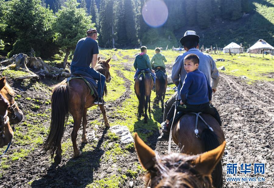 在新疆特克斯县境内的夏牧场里,小朋友跟随家人一起放牧(6月30日摄)。新华社记者 王菲 摄
