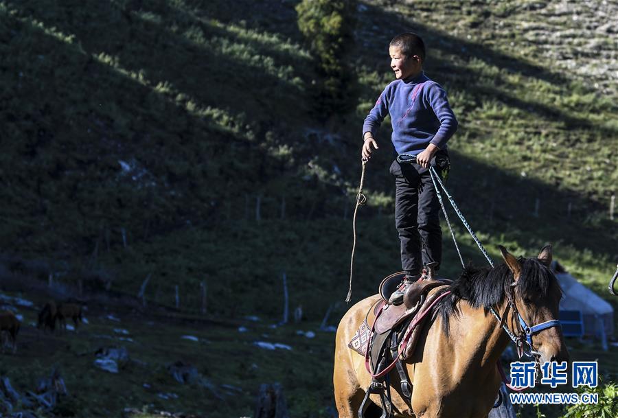 在新疆特克斯县境内的夏牧场里,一名小朋友站在马背上玩耍(6月30日摄)。新华社记者 王菲 摄