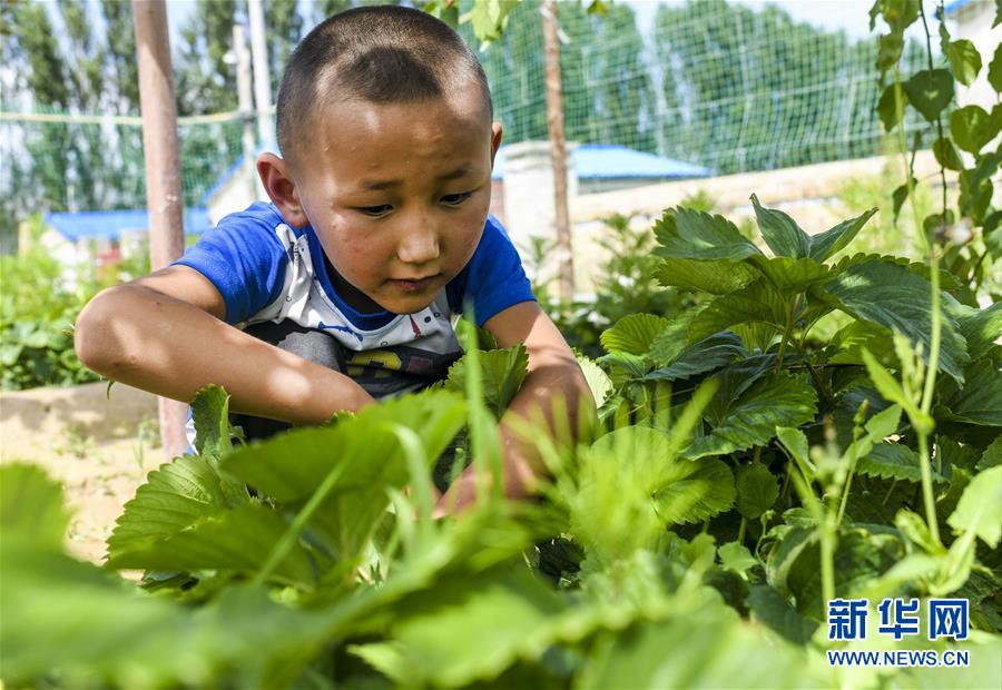 在新疆特克斯县境内的牧民定居点,一名小朋友帮家人采摘自家种植的水果(7月6日摄)。新华社记者 王菲 摄