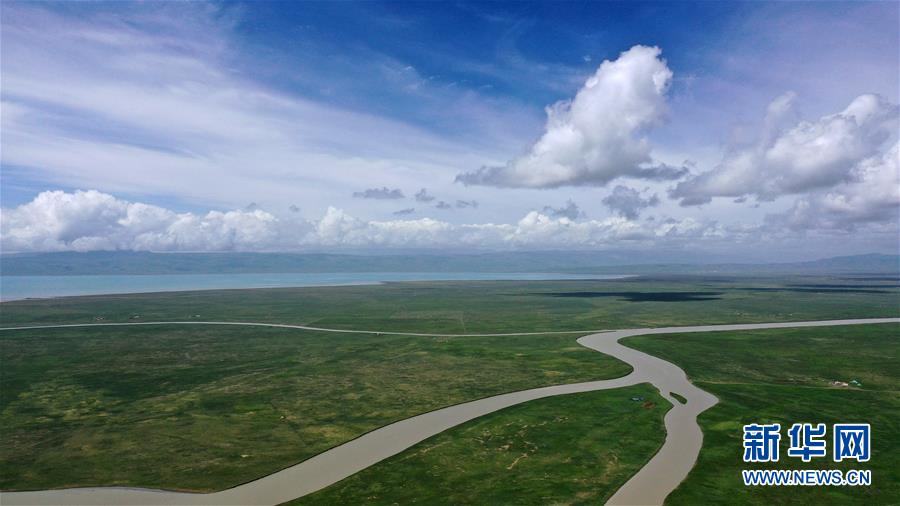 7月10日拍摄的青海湖畔风光(无人机照片)。 盛夏时节,被誉为“中国最美湖泊”的青海湖畔景色宜人,蓝天、白云、湖水与草原组成一幅壮美的画卷。 新华社记者 张宏祥 摄