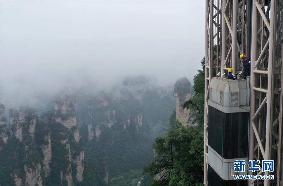7月13日,湖南张家界市武陵源区百龙天梯工作人员在悬崖钢井架上巡检(无人机照片)。针对今年夏季降雨量大、持续时间长的情况,张家界市武陵源区组织各景区旅游企业在完善应急保障机制的基础上,加大对载人旅游设施的检查力度,确保汛期游览安全。 新华社发(吴勇兵 摄)
