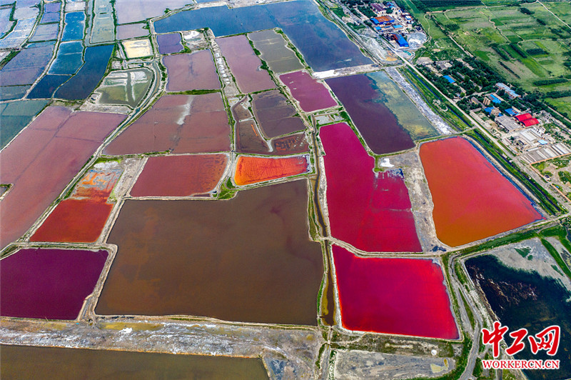 2020年7月13日、14日,山西运城,航拍盐湖景区色彩斑斓的景观。(薛俊/视觉中国)