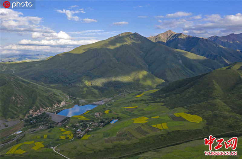 2020年7月14日,俯瞰甘肃省武威市古浪县古丰镇千亩油菜花基地。(姜爱平/IC photo)