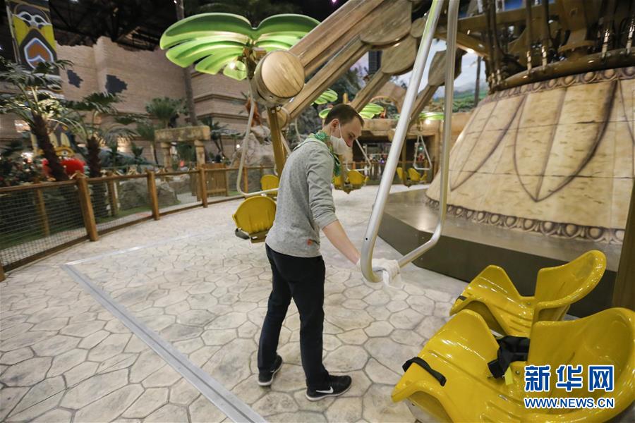 7月18日,在俄罗斯首都莫斯科的“梦之岛”游乐园,工作人员对游乐设施消毒。 当日,受新冠疫情影响关闭数月的“梦之岛”游乐园恢复对公众开放。 新华社发(亚历山大摄)