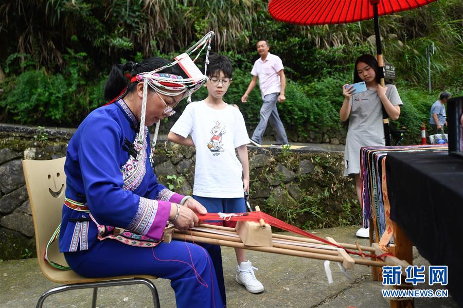 7月18日,游客在戴家山村观看畲族彩带编织技艺。 新华社记者 黄宗治 摄