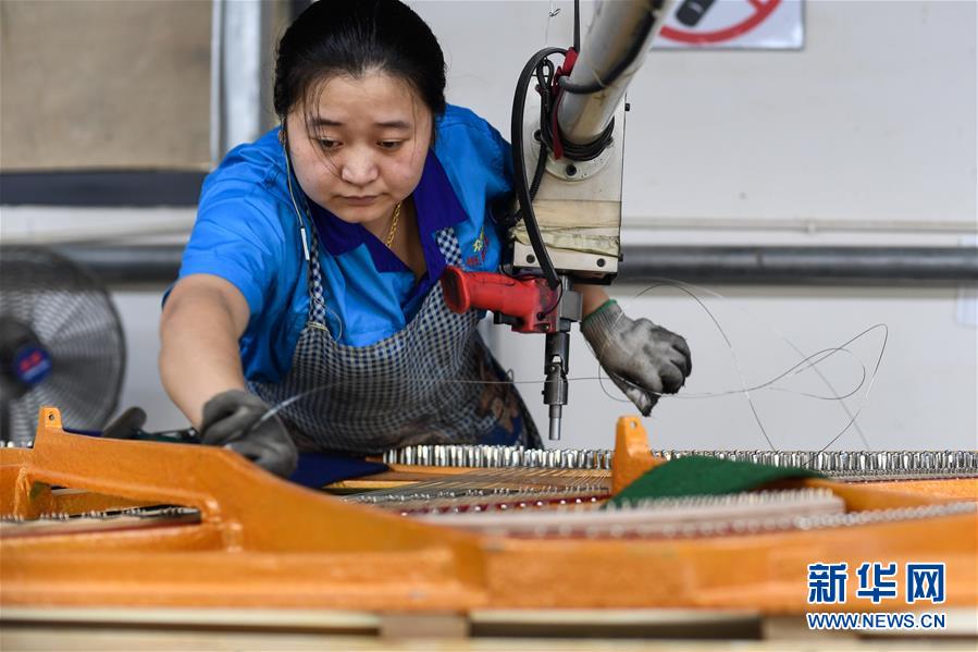 7月19日,工人在洛舍镇东衡村钢琴文化园内一家钢琴企业的车间里装配琴弦。新华社记者 黄宗治 摄