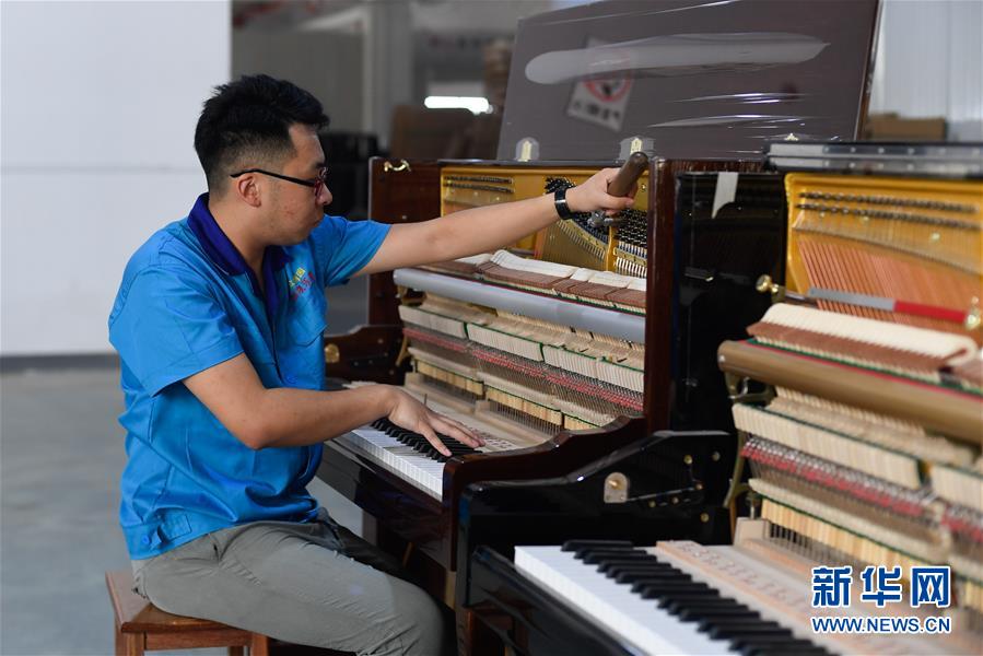7月19日,工人在洛舍镇东衡村钢琴文化园内一家钢琴企业的车间里调音。新华社记者 黄宗治 摄