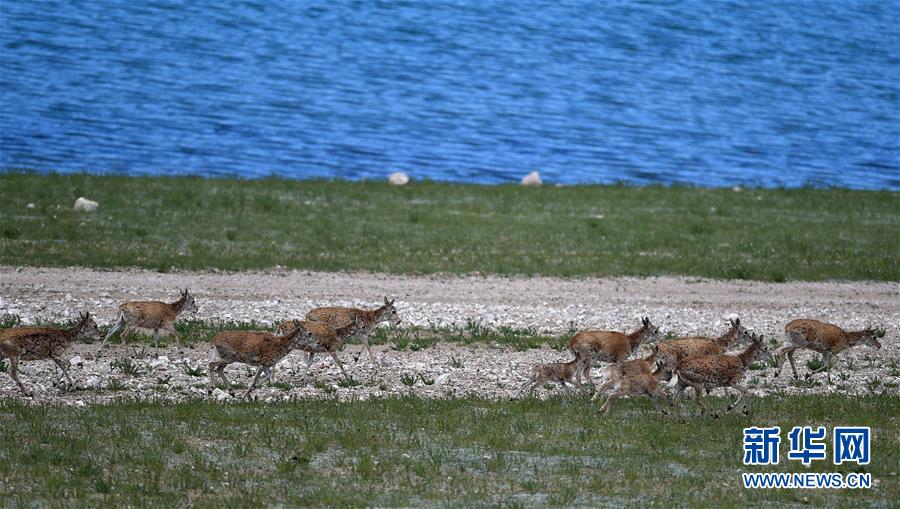 7月19日,藏羚羊群在错鄂湖旁行进。 2000年,西藏羌塘自然保护区晋升为国家级自然保护区。20年来,经过西藏各级各部门的不懈努力,羌塘国家级自然保护区内的重点保护野生动物种群数量明显增加,其中,藏羚羊种群数量由原来的5至7万只,恢复到目前的15万只以上。羌塘国家级自然保护区核心地带的西藏尼玛县荣玛乡附近,目前就有近6万只藏羚羊。 新华社记者 觉果 摄