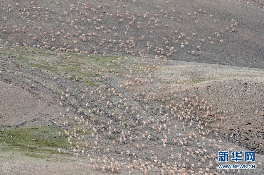 7月17日,藏羚羊群在西藏尼玛县荣玛乡附近悠闲吃草。 2000年,西藏羌塘自然保护区晋升为国家级自然保护区。20年来,经过西藏各级各部门的不懈努力,羌塘国家级自然保护区内的重点保护野生动物种群数量明显增加,其中,藏羚羊种群数量由原来的5至7万只,恢复到目前的15万只以上。羌塘国家级自然保护区核心地带的西藏尼玛县荣玛乡附近,目前就有近6万只藏羚羊。 新华社记者 觉果 摄