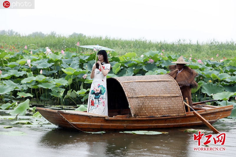 2020年7月21日,游客在江苏省扬州市宝应县射阳湖镇荷园花海的荷塘景观带中划船畅游。图片署名:沈冬兵/IC photo