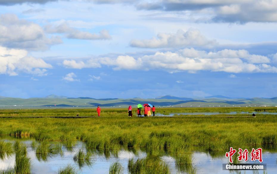 若尔盖花湖位于四川省阿坝藏族羌族自治州若尔盖县境内,是热尔大坝草原上的一个天然海子,天地之间,绿草茵茵,繁花似锦,草地中星罗棋布地点缀着无数小湖泊,湖水碧蓝,宛如一颗镶嵌在213国道边的宝石,吸引众多游客前来观光。图为7月21日拍摄的花湖风光。