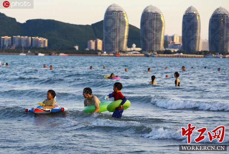 2020年7月22日,海南三亚,家长带孩子在三亚市三亚湾戏水。图片来源:不二/IC photo
