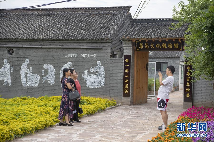 7月21日,游客在飞岭村的药茶文化体验馆前合影。新华社记者 杨晨光 摄