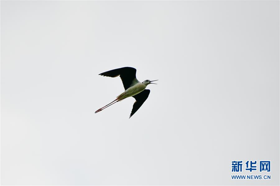 7月23日,一只黑翅长脚鹬在天津大黄堡湿地自然保护区上空飞翔。新华社发(孙凡越 摄)