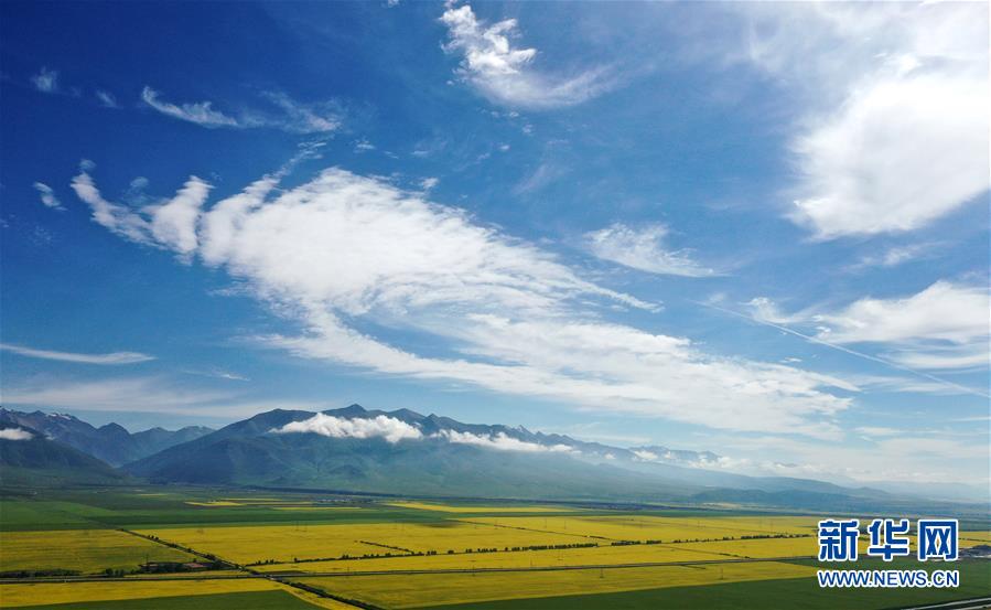 这是7月22日拍摄的门源回族自治县的油菜花田(无人机照片)。 时下正值高原油菜花竞相绽放的季节,在青海省海北藏族自治州门源回族自治县,金黄色的油菜花在高原蓝天和云雾映衬下形成一幅壮丽画卷,吸引游客前来观赏。 新华社记者 张宏祥 摄