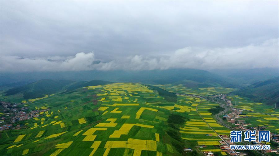 7月23日在门源回族自治县拍摄的雨后田园风光(无人机照片)。 时下正值高原油菜花竞相绽放的季节,在青海省海北藏族自治州门源回族自治县,金黄色的油菜花在高原蓝天和云雾映衬下形成一幅壮丽画卷,吸引游客前来观赏。 新华社记者 张宏祥 摄