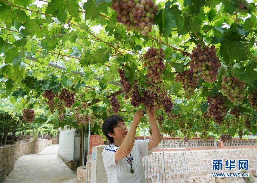 7月27日,昌黎县十里铺乡西山场村村民在管护自家庭院的葡萄。 近年来,河北省昌黎县在建设生态宜居美丽乡村的过程中,推进村容村貌和人居环境改善,结合当地旅游资源走“农旅”融合发展的道路,既绿化美化了家园,又增加了农民的收入,为农村发展注入新活力,助力乡村振兴。 新华社记者 杨世尧 摄