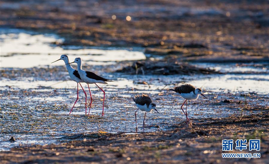 7月28日,长脚鹬在桃力庙—阿拉善湾海子觅食。 鄂尔多斯湿地位于库布齐沙漠、毛乌素沙地接壤地带,2002年被列入国际重要湿地名录。从2006年开始,由于湿地湖面萎缩、湖心岛消失,在此筑巢繁殖的世界濒危物种遗鸥几近消失。近年来,当地采取多种治理措施,湿地生态环境逐步好转。2019年起,湿地内的桃力庙—阿拉善湾海子迎来遗鸥大规模“回归”。如今,40多种鸟类在此栖息,鄂尔多斯湿地重新成为鸟类的乐园。 新华社记者 连振 摄