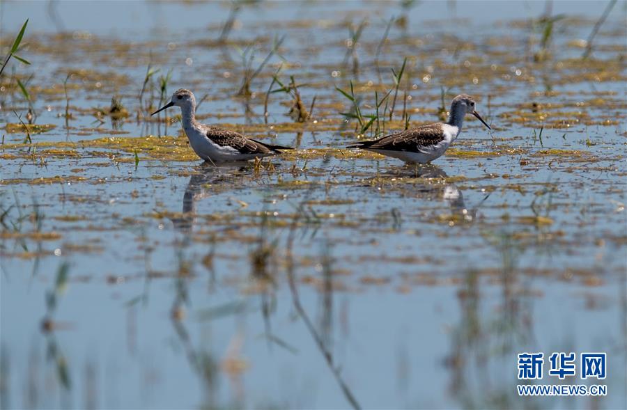7月28日,两只长脚鹬在桃力庙—阿拉善湾海子觅食。 鄂尔多斯湿地位于库布齐沙漠、毛乌素沙地接壤地带,2002年被列入国际重要湿地名录。从2006年开始,由于湿地湖面萎缩、湖心岛消失,在此筑巢繁殖的世界濒危物种遗鸥几近消失。近年来,当地采取多种治理措施,湿地生态环境逐步好转。2019年起,湿地内的桃力庙—阿拉善湾海子迎来遗鸥大规模“回归”。如今,40多种鸟类在此栖息,鄂尔多斯湿地重新成为鸟类的乐园。 新华社记者 连振 摄