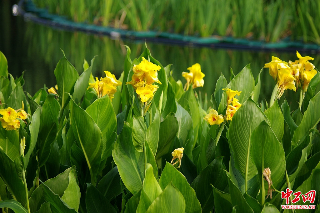 2020年7月29日,河北省邯郸市鸡泽县环城水系中的生态浮岛,经过一段时间运行,浮岛上的植物花团锦簇,姹紫嫣红,成为县城一道靓丽景观。金书怀/视觉中国