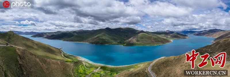 2020年7月28日,西藏。航拍西藏羊卓雍错措,其湖面平静,一片翠蓝,仿佛如山南高原上的蓝宝石,美到让人窒息。 图片来源:田野/IC photo