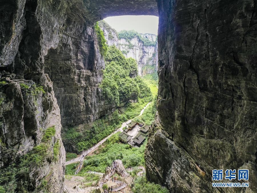 7月29日,游客在天生三桥景区内的天龙桥景点游览(无人机照片)。 新华社记者 刘潺 摄