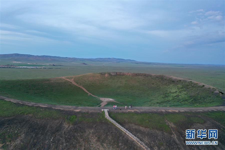 7月29日,游客在乌兰哈达火山群的一处火山口游玩(无人机照片)。新华社记者 刘磊 摄